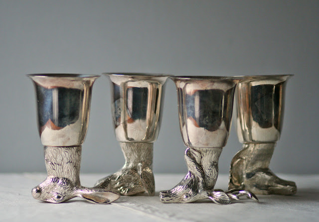 this past weekend I'm excited to find these set of four silverplated animal goblet from Goodwill. At first glance I thought they were bells but they stand on their heads, how awesome is that! When I got home, I searched the internet and found similar ones on ebay for a grand?! Speaking of awesomeness, you know you got something really awesome in your shopping cart when a few shopper just can't help themselves but to stop on their tracks, gawked, touch and feel the items IN your cart. I don't mind the staring, but touching it? "Um hello sir, you are invading my privacy by touching the items inside my cart, I am afterall holding the cart so you know it's mine right?" ok I am probably overly sensitive but still, it's just strange.